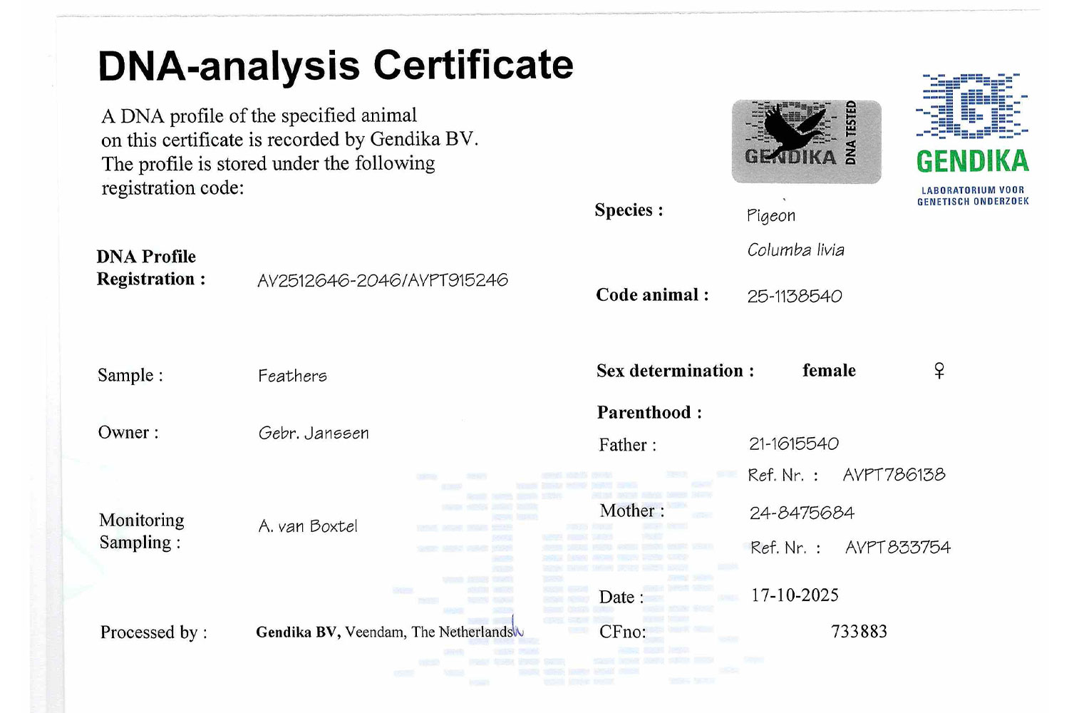 LOT 19 => ♀ DNA CERTIFIED & SEX DETERMINATION FATHER: BRTHR. “ROBIN”