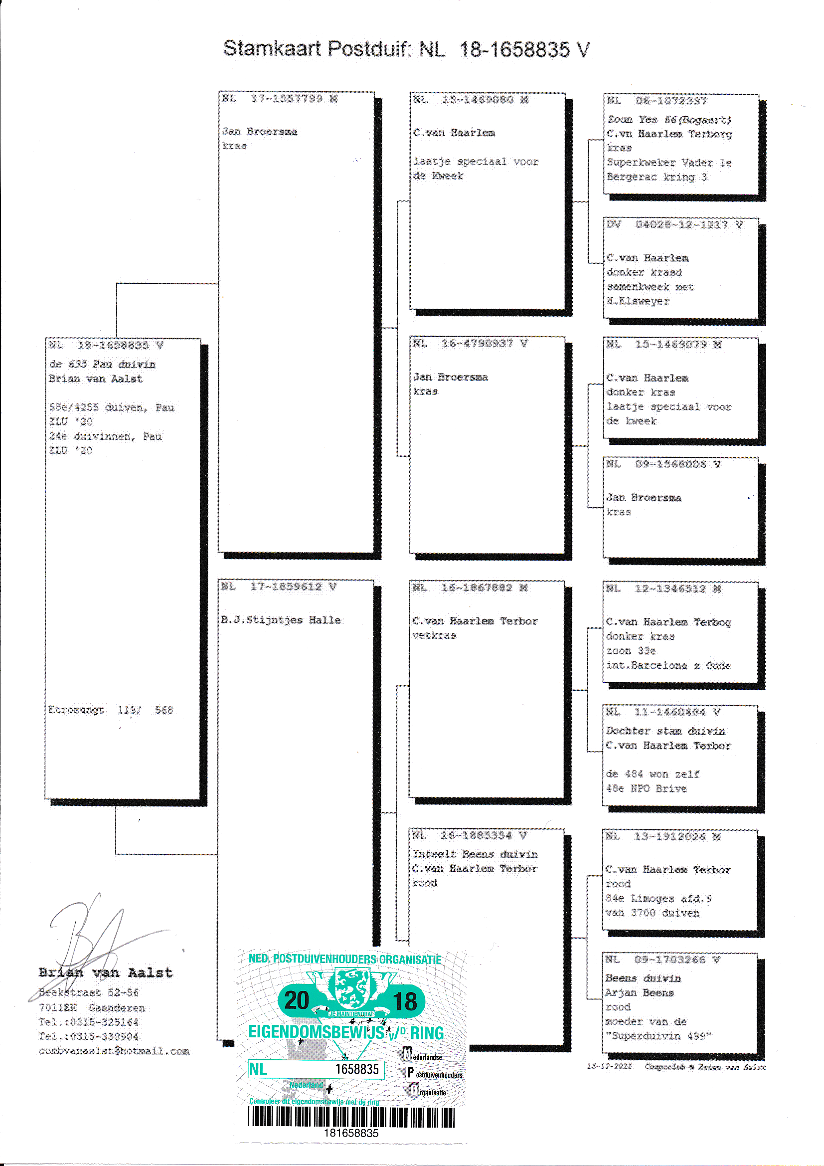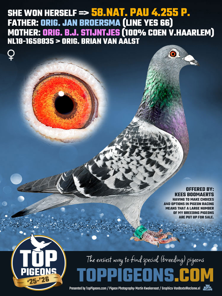 zeer zachte duivin vliegt 58 nat ZLU Pau 2020, afstamming C van Haarlem. Jaarling hieruit vliegt meteen prijs op Agen.