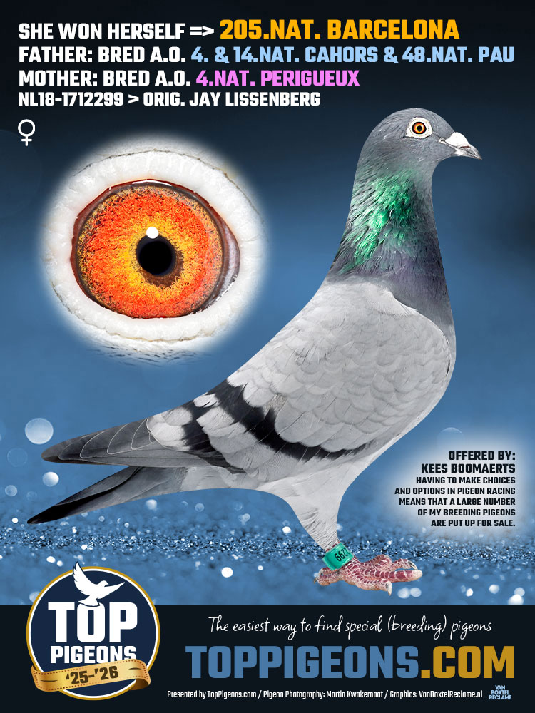 Mooie prestatieduivin vliegt 205 nat ZLU Barcelona 2021. Afkomstig van Jay Lissenberg.