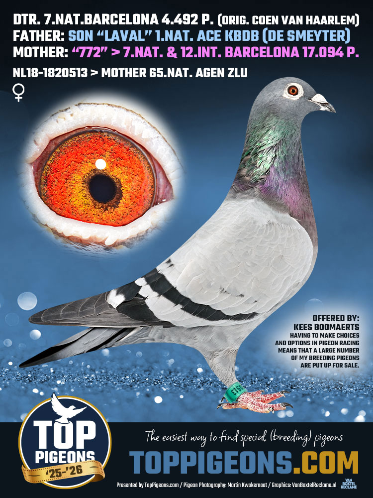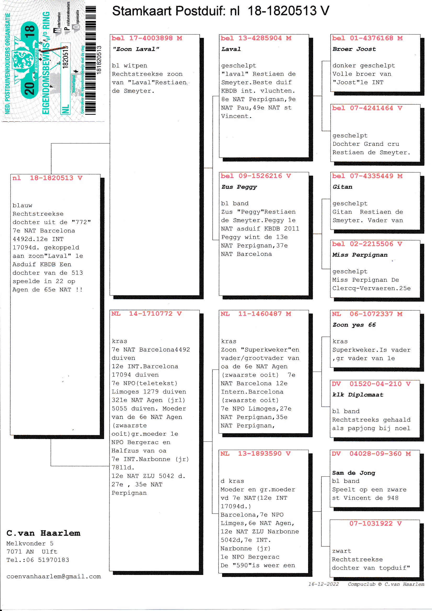 Zeer goede kweekduivin rechtstreeks uit de 772 van C van Haarlem. Mdr van 65e nat ZLU Agen 2022.
