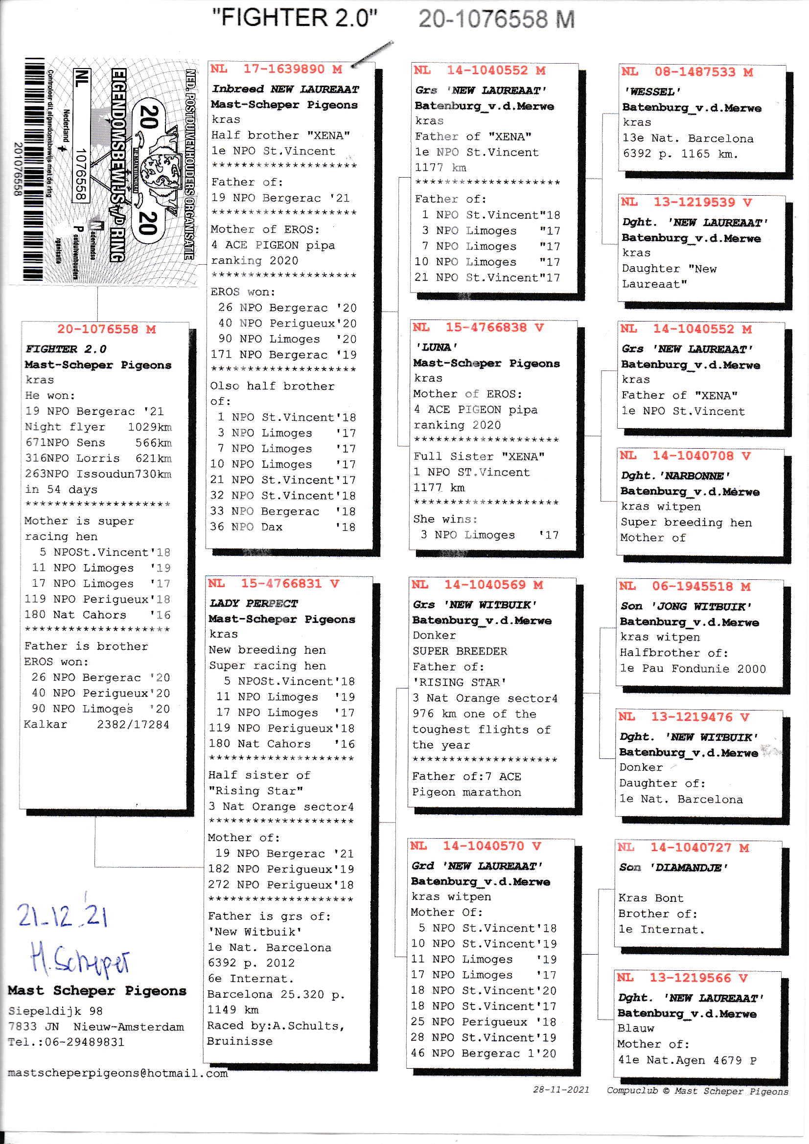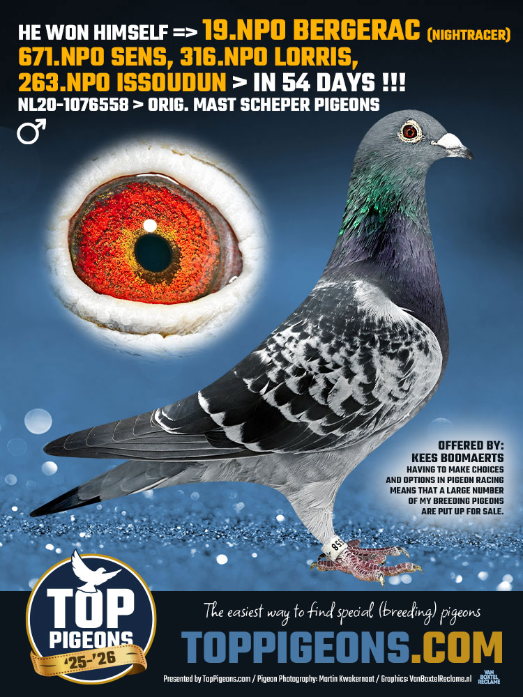 Topduif Fighter 2.0 Zoon van Lady Perfect. Vliegt zelf 4 prijzen op de fond in 54 dgn. Waaronder 19e NPO Bergerac.