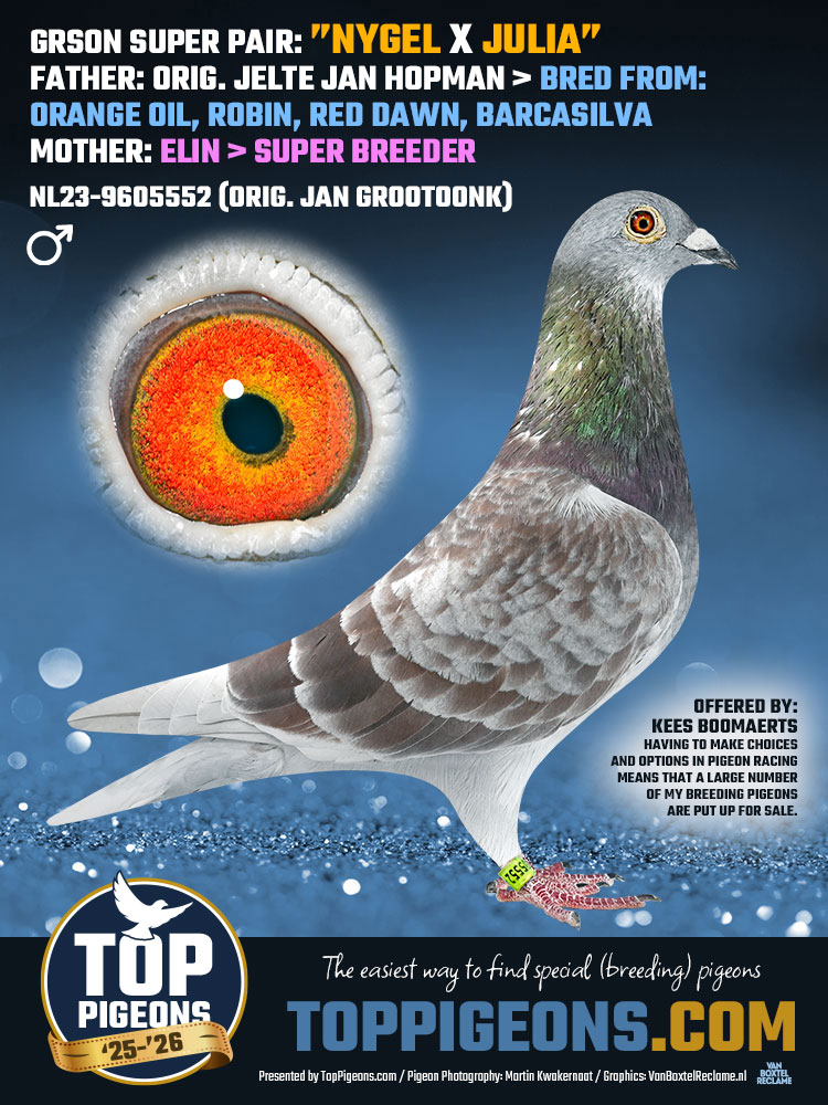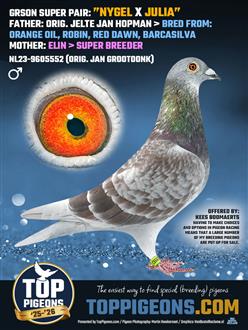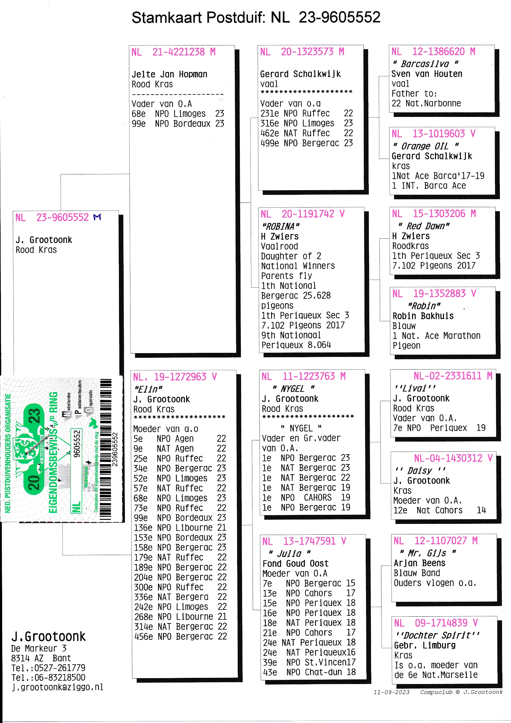 Gespierde rode doffer Jan Grootoonk. Dubbele lijnenteelt Mr. Gijs, Klz Nygel, met Robin en Red Dawn en Orange Oil in de afstamming.
