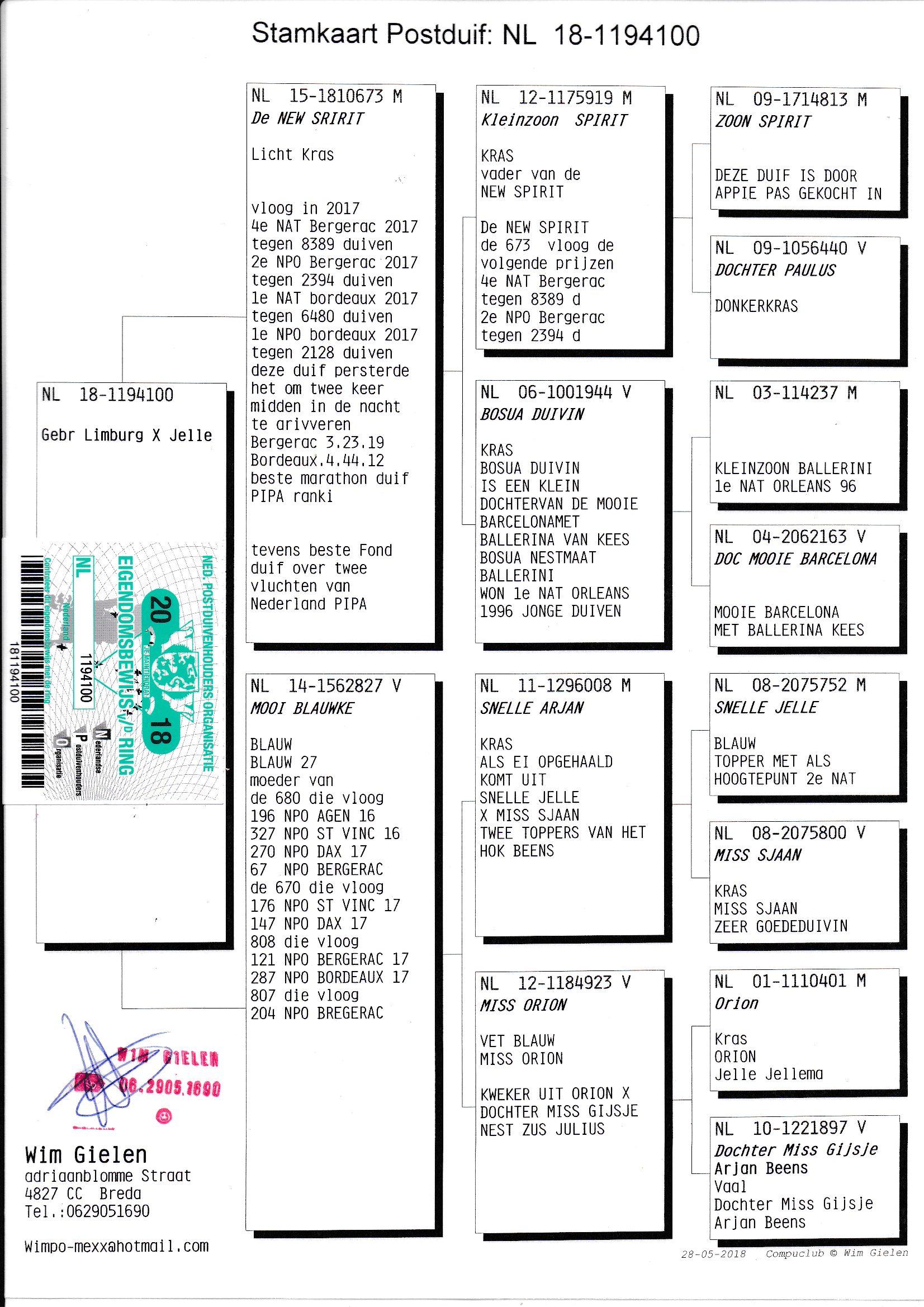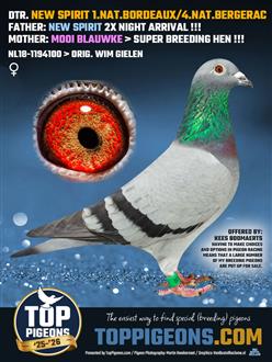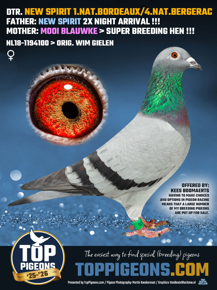 Uit super vlieger en kweker de New Spirit 1e nat Bordeaux en 4e nat Bergerac x Mooi Blauwke Wim Gielen. Mooi Blauwke (is moeder van Jorg 1e nat St Vincent en volle broer Jezus). Uit deze koppeling komen meerdere goede kwekers. 10e nat Narbonne 24 van Jan Grootoonk komt uit broer x zus uit deze koppeling(zie ook afstamming van Nl24-8091569). Mooi Blauwke is volle zus van Snelle 15(o.a. moeder van de Blauwe Hulk 2e nat Dax en 4e nat Bergerac) Jan Grootoonk.