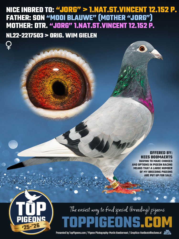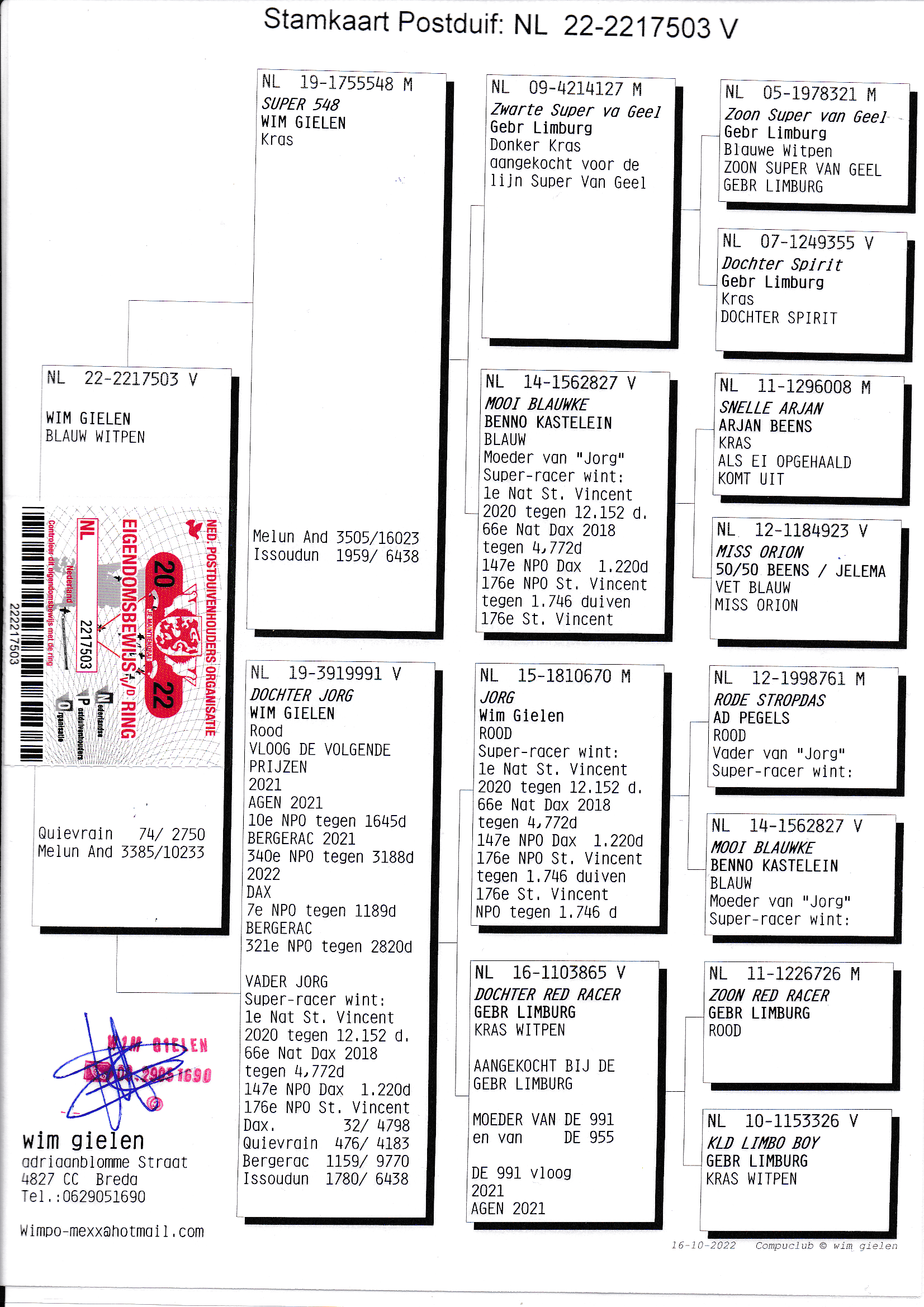 zeer sterk gebouwde duivin uit zeer goede vlieg- en kweekduivin van Wim Gielen. Afst: Gebr. Limburg, Jorg en Mooi Blauwke.