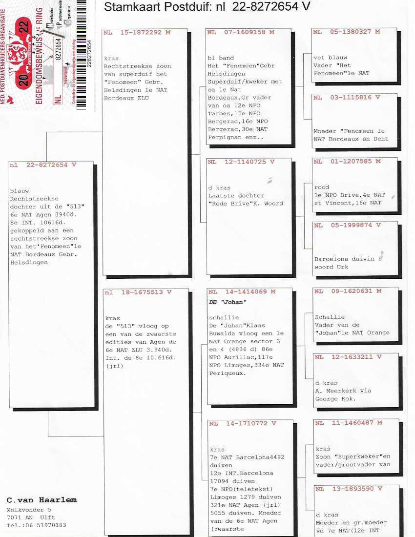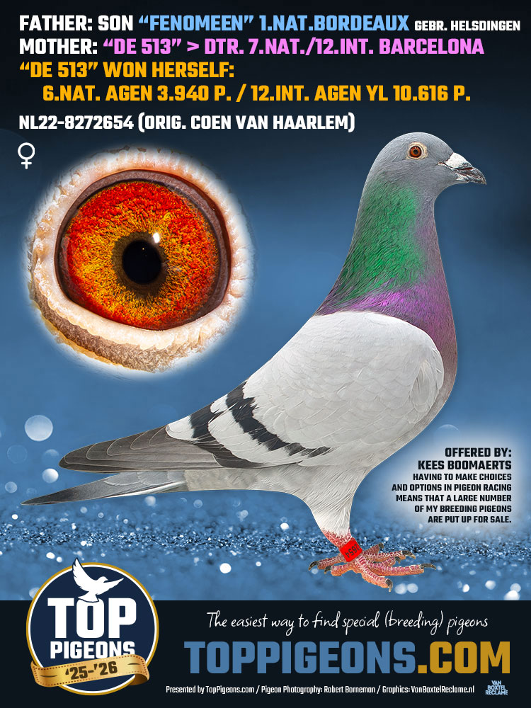 Zeer vitale duivin C van Haarlem uit de 513. Deze vloog 6e nat ZLU Agen 2019, een van de taaiste ooit. Kleindochter van De Johan van Klaas Buwalda en de 772.