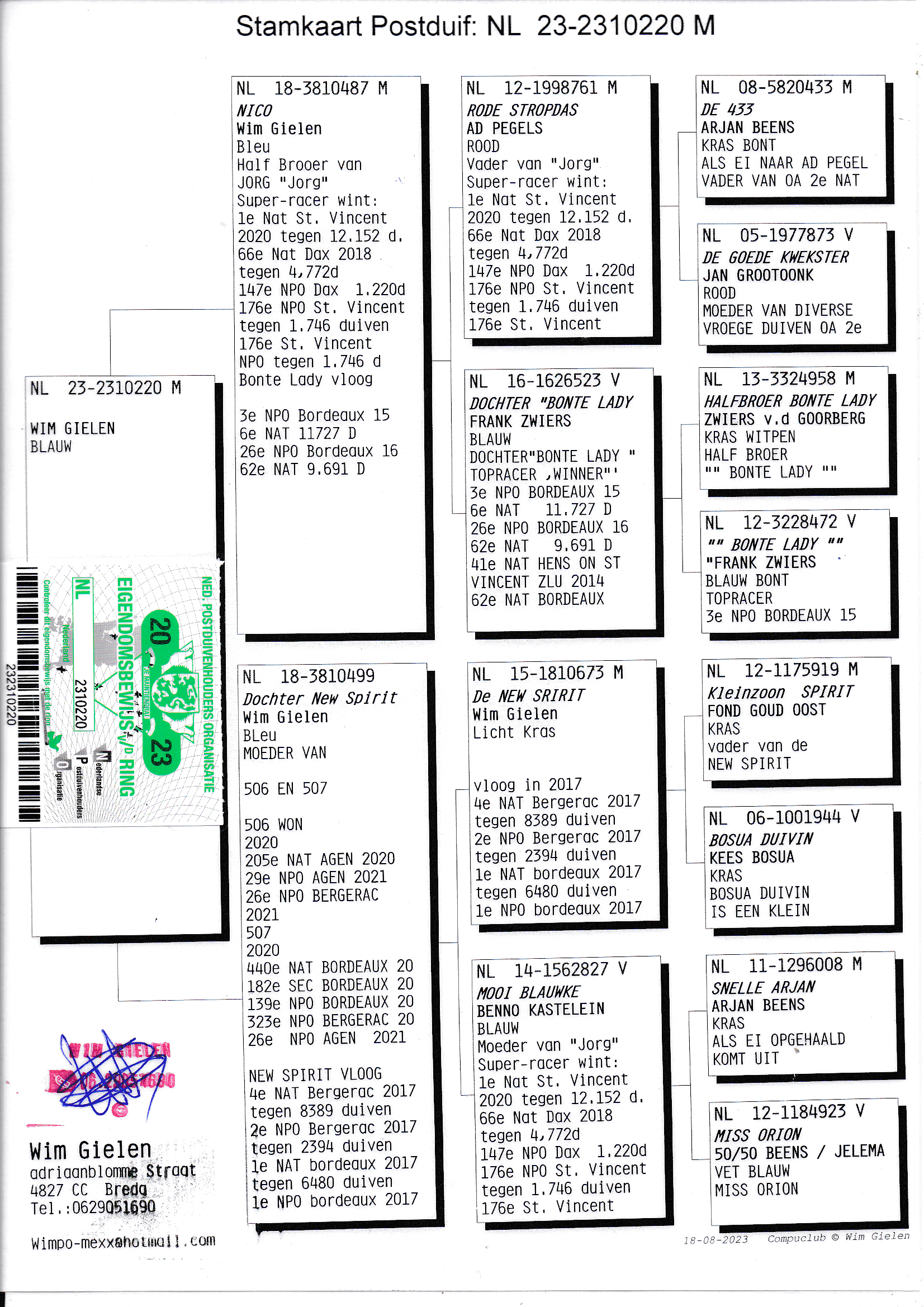 NL23-2310220: volle broer van 2 goede vliegers van Wim Gielen. KLz Rode Stropdas, De New Spirit en Mooi Blauwke.