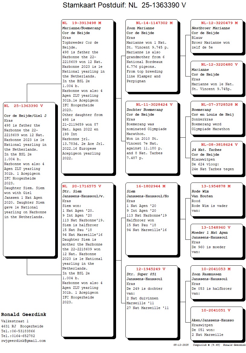 Vader NL19-3913498 is rechtstreeks Cor de Heijde, komt uit zoon 1e Nationaal St. Vincent tegen 9.672 duiven in 2014. ‘Marianne’ is grootmoeder van de 2e Nationaal Barcelona, 6e Nationaal Bordeaux en 22e Nat. Narbonne. Zus ‘Marianne’ won de 12e Nat. Cahors en de 22e Nationaal Perpignan.