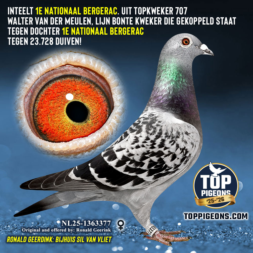 Koop 8 NL25-1363377 kras duivin, inteelt 1e Nationaal Bergerac. Uit topkweker 707 Walter van der Meulen, lijn Bonte kweker die gekoppeld staat tegen dochter 1e Nationaal Bergerac tegen 23.728 duiven!