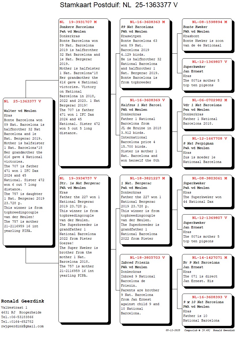 Vader NL19-3931707 rechtstreeks van Walter van der Meulen komt uit de 89e Nationaal Barcelona 2019 tegen 4.129 duiven en is halfbroer van de 1e Nationaal Bergerac 2019 tegen 23.728 duiven. Deze lijn van de ‘Bonte kweker’ is bij van Walter der Meulen één van zijn beste lijnen voor Barcelona.