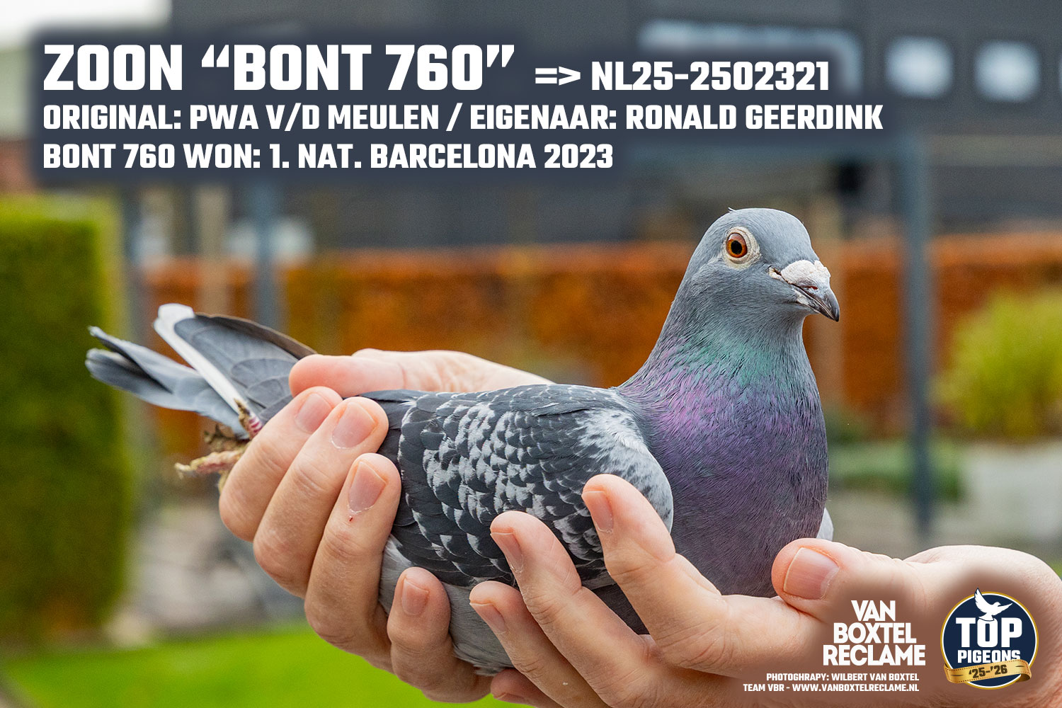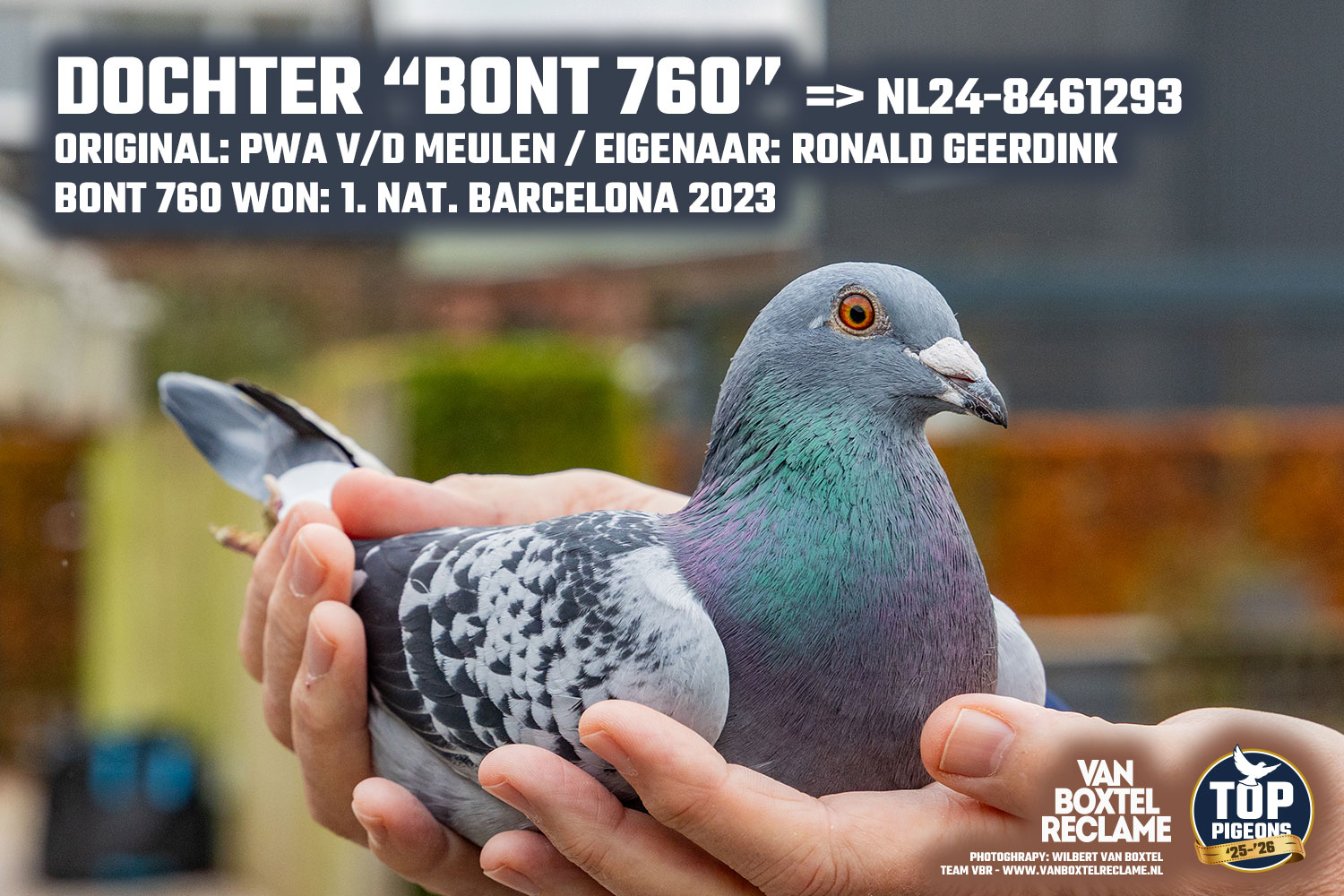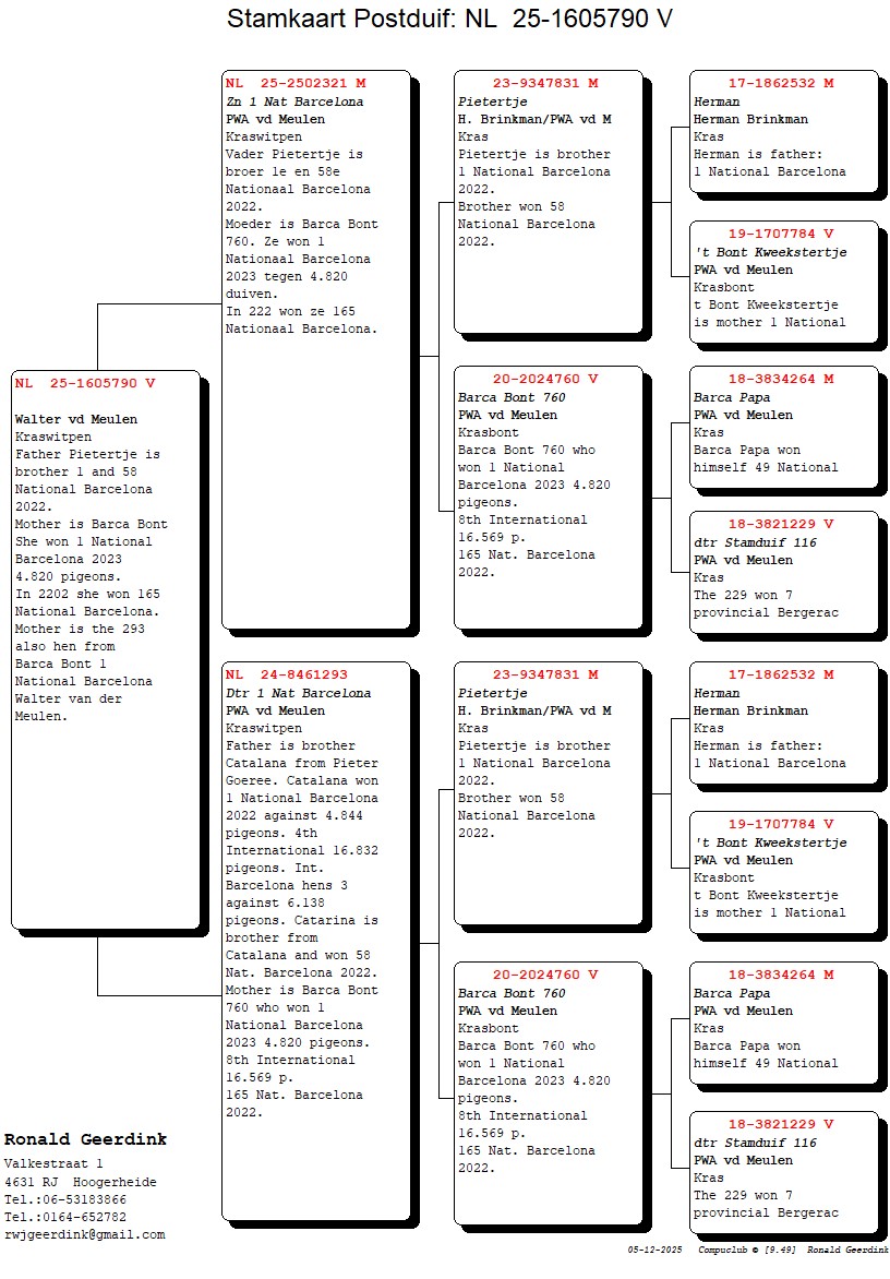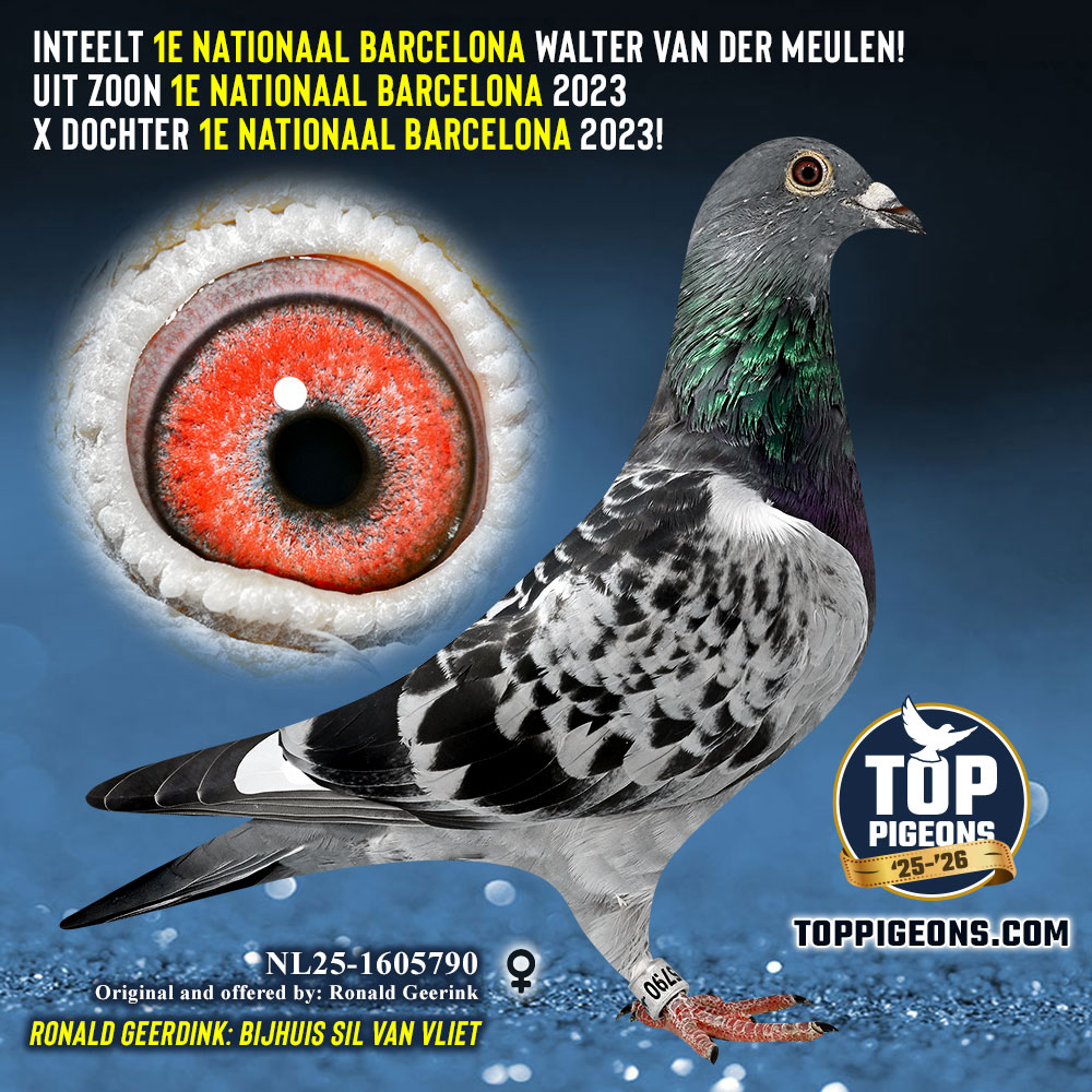Moeder NL24-8461293 is een dochter van ‘Pietertje’, broer van de 1e Nationaal Barcelona van Pieter Goeree. ‘Pietertje’ werd gekoppeld aan ‘Barca Bont’ de 1e Nationale Barcelona winnares van Walter van der Meulen in 2023.
