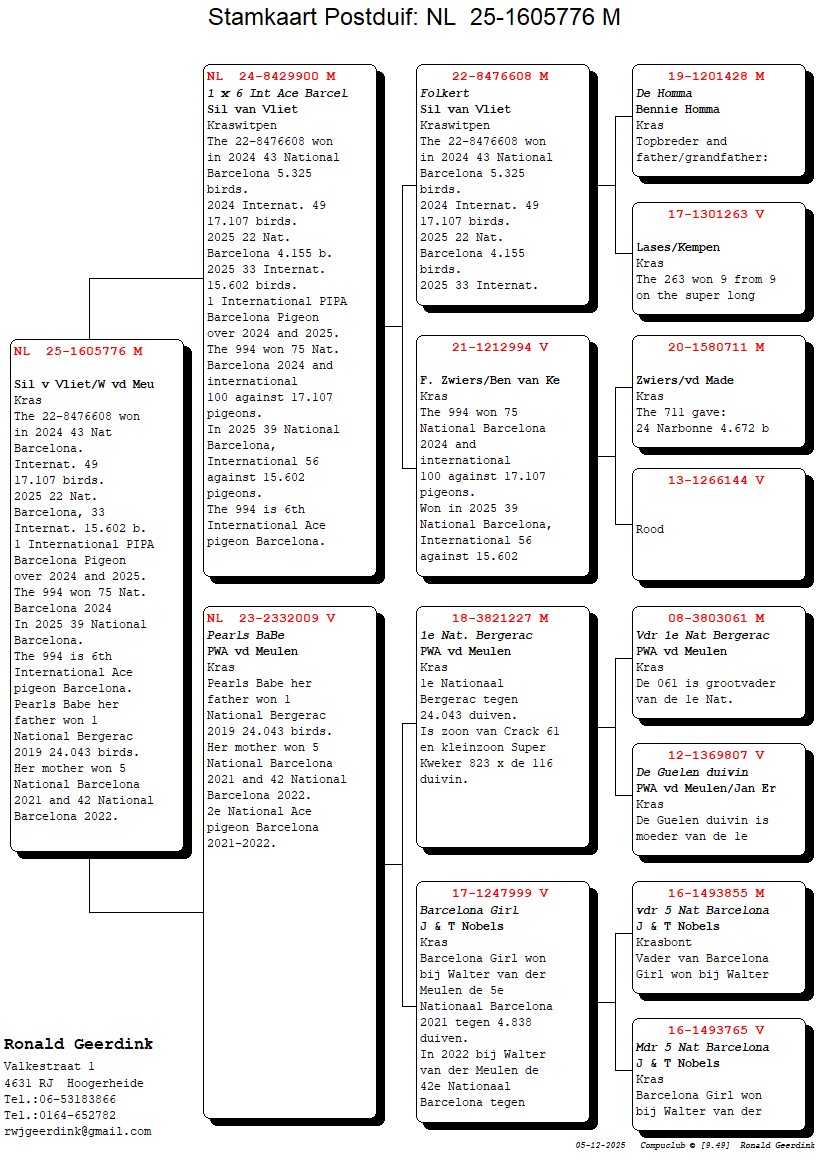 Moeder NL23-2332009 rechtstreeks Walter van der Meulen is dochter van de 1e Nationaal Bergerac 2019 tegen 23.728 duiven maal ‘Barcelona Girl’ die bij Walter van der Meulen de 5e Nationaal Barcelona 2021 tegen 4.838 duiven en de 42e Nationaal Barcelona tegen 4.842 duiven won. Hiermee werd ze 2e Nationale Asduif Barcelona 2021-2022!