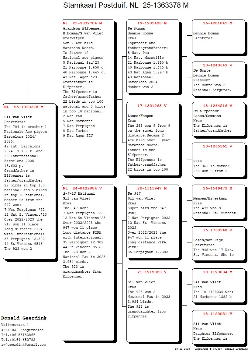 Vader NL23-9332704 rechtstreeks Sil van Vliet. Ronald Geerdink kocht vanaf 2023 16 duiven uit de beste vliegduiven en kweekduiven van wonderboy Sil van Vliet.