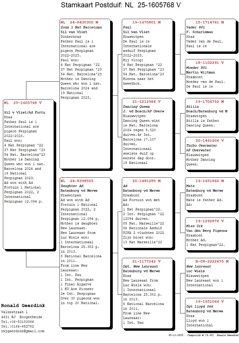 De broer van Ad won: 13 Nat. Marseille 2022, 27 Nat. St. Vincent ZLU 2024, 43 Nat. Marseille 2024, 62 Nat. Agen 2023, 65 Nat. Narbonne 2023 en 75 Nat. Marseille 2022. Moeder van de 1e Nationaal Perpignan is ‘Miss Urk’, superkweekster en dochter van 1e Internationaal Pau en 1e Internationaal Perpignan van van de Berg Pigeons.