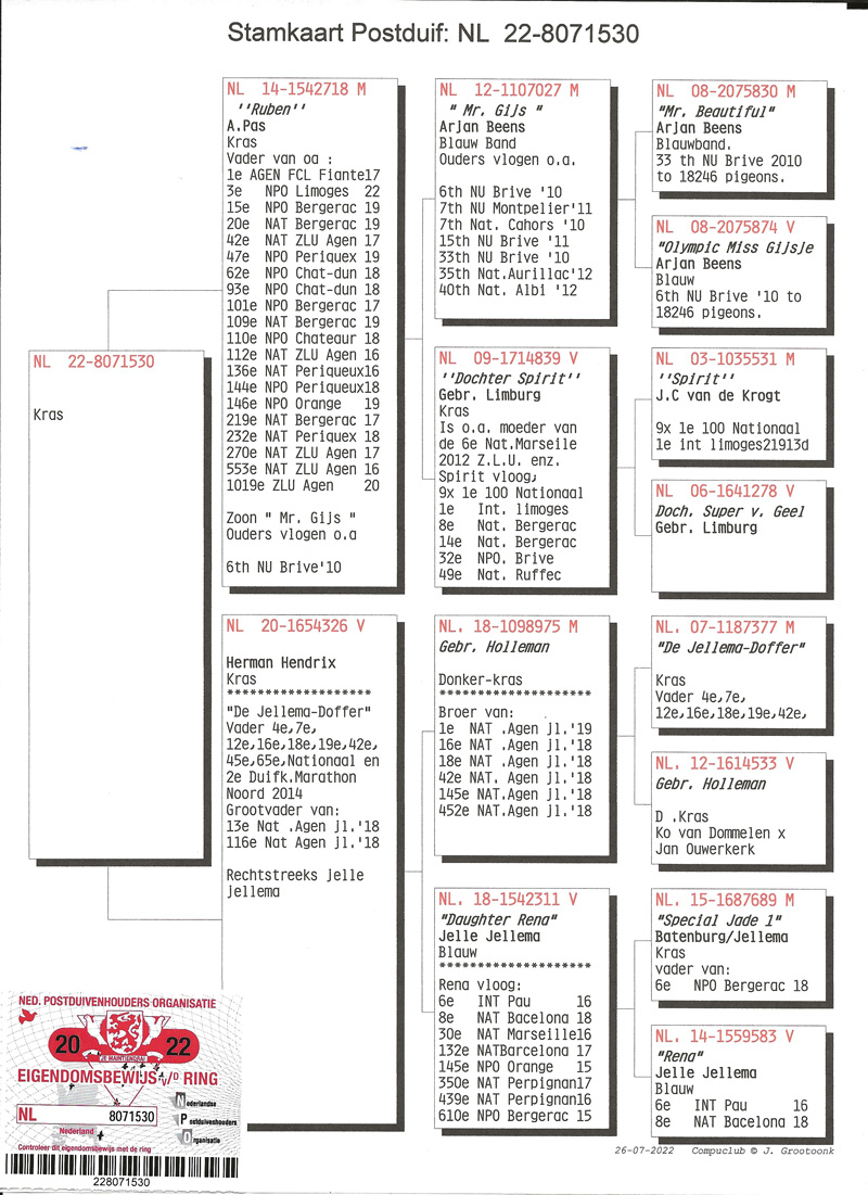 De vader van ‘Ruben’ is ‘Mr. Gijs’ van Arjan Beens. Zoon van ‘Mr. Beautifull’ maal ‘Olympic Miss. Gijsje’. Moeder is dochter ‘Spirit’ van Gebr. Limburg. Deze dochter ‘Spirit’ is moeder van de 6e Nationaal Marseille 2012. ‘Spirit’ won: