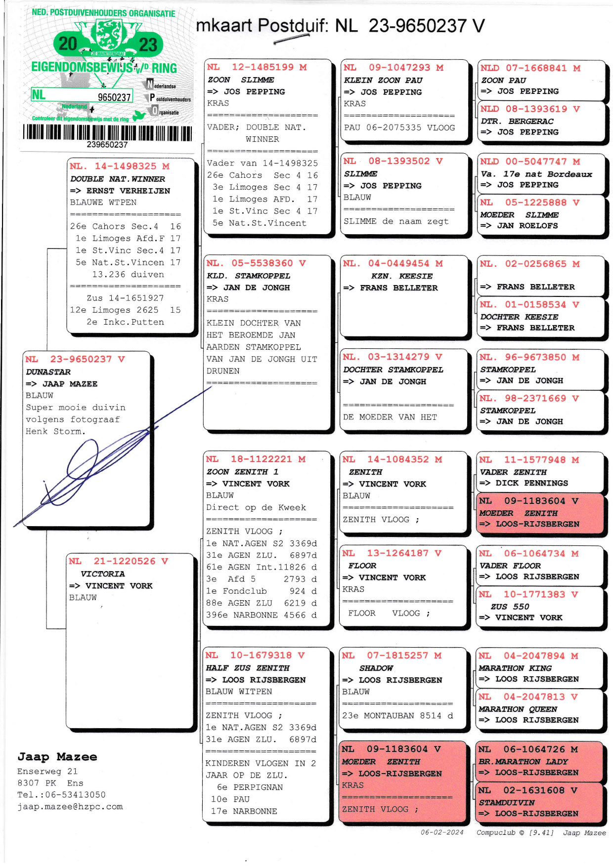 Pedigree Jaap Mazee, "Dtr. Double Nat. Winner"