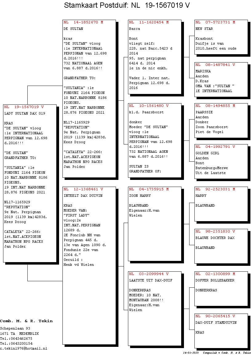 Pedigree M. & R. Tekin, "De Sultan x First Lady"