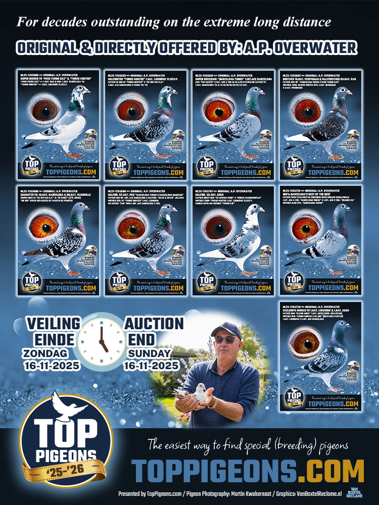 Superveiling met 9 topduiven Rechtstreeks aangeboden door: A.P. Overwater Al decennialang top op de grote fond. A.P. Overwater heeft een geweldige stam duiven opgebouwd op basis van het ijzersterke fundament van Bas Batenburg en Peter van den Eijnden. A.P. Overwater heeft zijn eigen stam gecreëerd Die internationaal bekend staat als... 🔥 "de A.P. Turbo's" 🔥 De onderstaande winnaars van A.P. zitten op het kweekhok en vele nakomelingen hebben hun enorme kweekwaarde al bewezen! En naast deze 3 toppers bezit A.P. Overwater een indrukwekkend kweekhok met daarop vele topduiven en bewezen kweeklijnen. Turbo Hunter 1. Nat. Bergerac 12.018 d. Miss Turbo Dax 1. Nat. Dax s2 2.131 d. Barcelona Turbo 1. Int. Asduif Barcelona 4 jr.