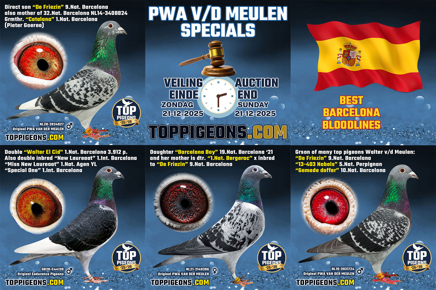 In deze verkoop ziet u 3 rechtstreekse duiven van Walter van der Meulen en 1 duif van Endurance Pigeons en dat is een dubbel kleinkind van “WALTER” 1. Nat. Barcelona.