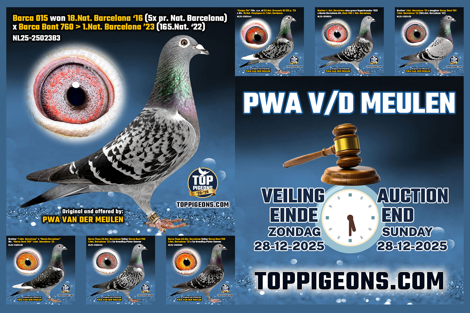 In deze veiling van Walter ziet u echt een ongelooflijk uniek aanbod aan duiven die direct komen uit de meest aansprekende vliegers en kwekers. Hieronder een paar voorbeeldjes maar u moet zeker de gehele veiling bekijken. En indien u in de gelegenheid bent is het zeker raadzaam om een pareltje van Walter van der Meulen aan te schaffen voor uw eigen marathon kweekhok.