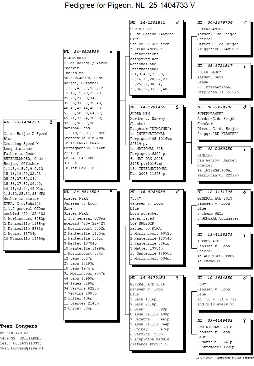 Pedigree Twan Bongers, "Klamper Kim x Sister Kyra"