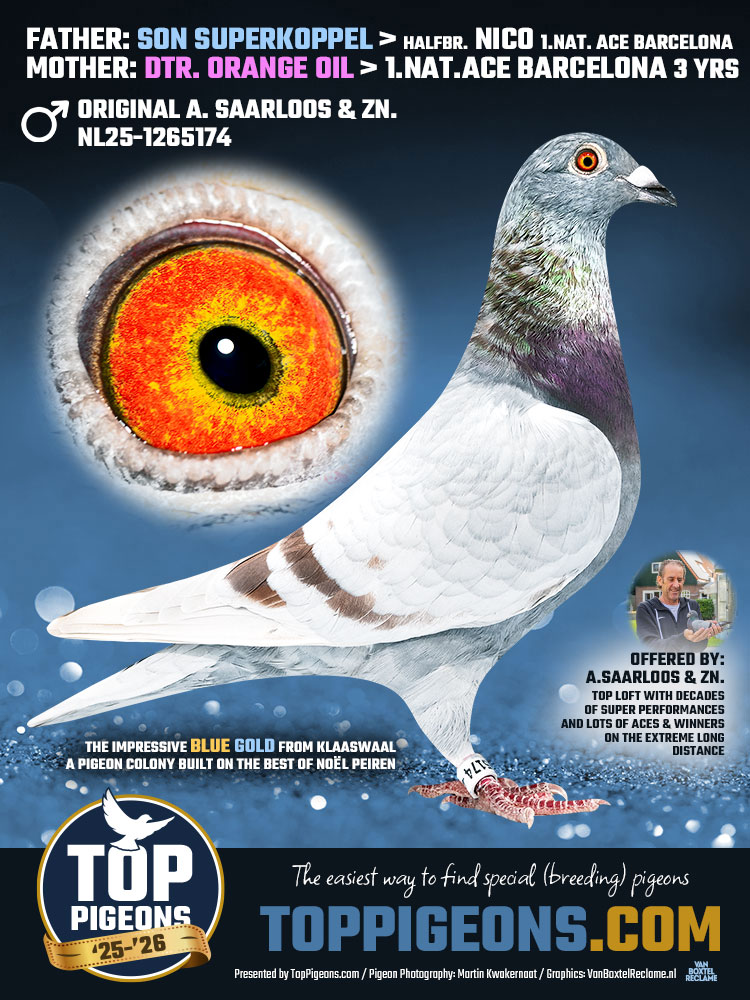 Your current position Home > Auctions > A. SAARLOOS & ZN uit Klaaswaal ♦ Topveiling met 12 bijzondere duiven > 12 - NL25-1265174 - A. Saarloos & Zn, "Son Superkoppel x Dtr. Orange