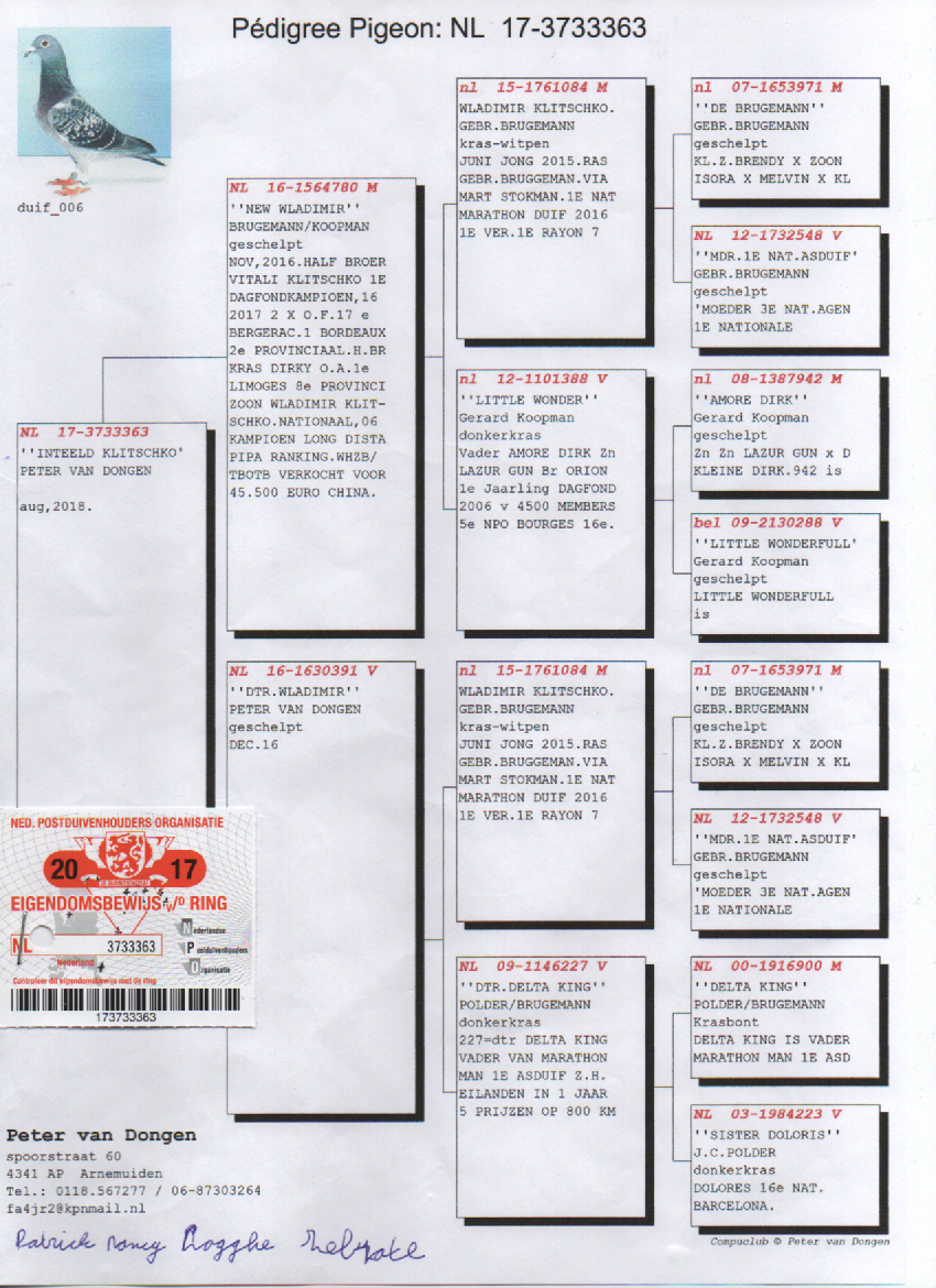 1e Limoges (8e Prov.) Zijn vader is WLADIMIR KLITSCHKO NL-15-1761084 en 1e Nat. ASDUIF MARATHON 2016. 1e Nat. duifkamp.'16, Marathon WHZB/TBOB. Hij komt uit lijnen van Gebr. Brugemann, Va: lijn OUDE 062 en MYRA x Mo: De SANDER x OUDE 062 x CHIBA. WLADIMIR KLITSCHKO is verkocht naar China voor €45.500,--