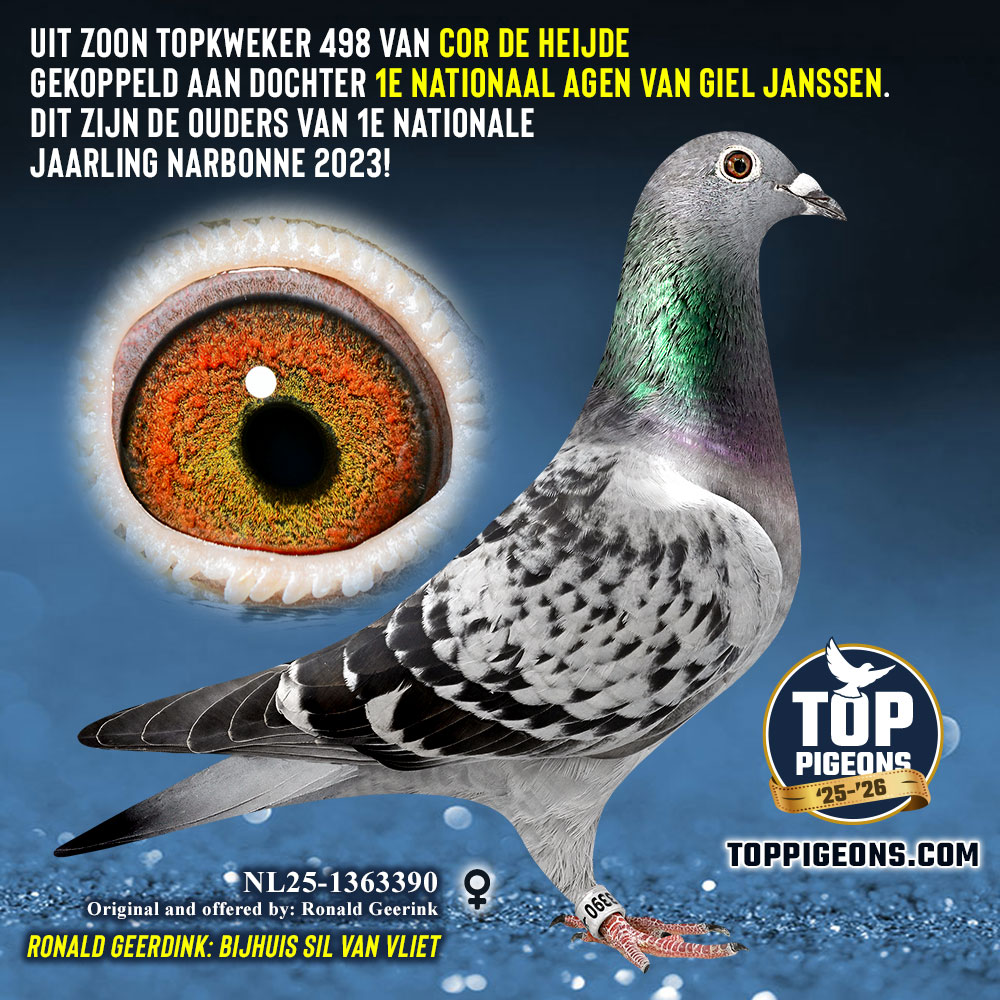 De 19-3913498 is vader van ‘de Narbonne’ 1e jaarling van Narbonne 2023 van Nederland. 12 Nationaal Narbonne tegen 5.296 duiven, 2 Brabantse Superleague (BSL) tegen 1.002 duiven, 4e Agen 301 duiven en 1e Asduif IFC Hoogerheide in 2023. De 498 is ook vader van de 659 ze won de 87e Nationaal Agen en de 199e Internationaal Narbonne in 2022. Ze was hiermee de 16e Europese Asduif Jaarlingen van de Grote Fond, aldus PIPA. Haar nestbroer de 660 vloog 7e Bergerac tegen 250 duiven. De 3e Agen 2025 tegen 228 duiven is wederom een zoon van de 498. Moeder NL20-1716575 is dochter van de ‘Siem’ van Giel Janssen uit Epen.