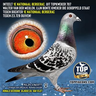Koop 8 NL25-1363377 kras duivin, inteelt 1e Nationaal Bergerac. Uit topkweker 707 Walter van der Meulen, lijn Bonte kweker die gekoppeld staat tegen dochter 1e Nationaal Bergerac tegen 23.728 duiven!