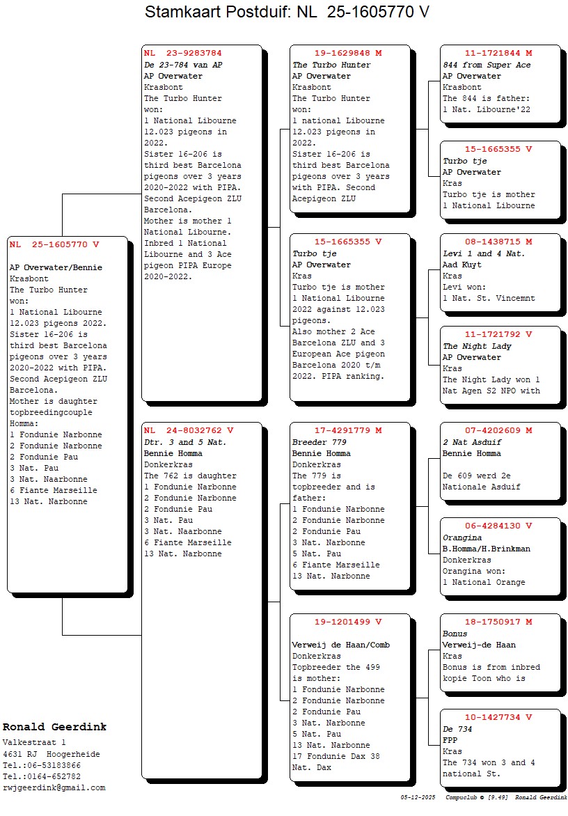 Koop 9 NL25-1605770 krasbont duivin. Uit zoon 1e Nationaal Libourne AP Overwater gekoppeld aan dochter super koppel Bennie Homma!