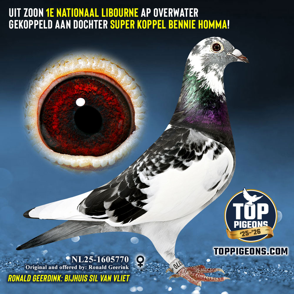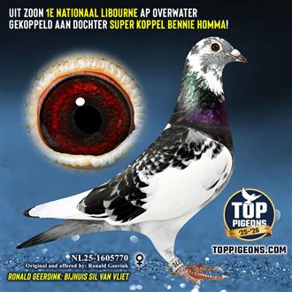 Vader NL23-9283784 rechtstreeks AP Overwater uit 1e Nationaal Libourne 2022 tegen 12.023 duiven. Zoon Libourne is een hele sterke en uiterst zacht gepluimde doffer. De zus van de Libourne werd 3e internationale Asduif PIPA van Barcelona over drie jaar. Bij de ZLU 2e Nationale Asduif Barcelona.