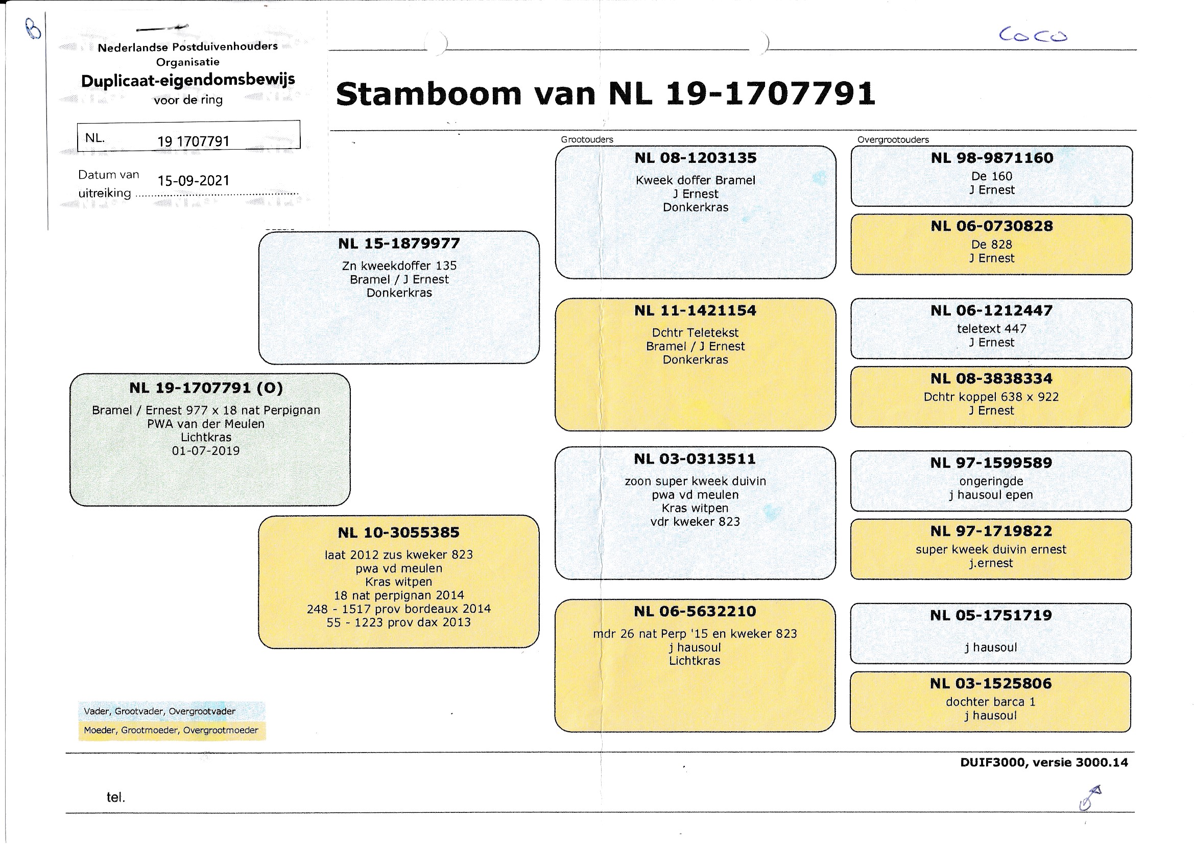 Pedigree PWA v/d Meulen, "Son 18. Nat. Perpignan"