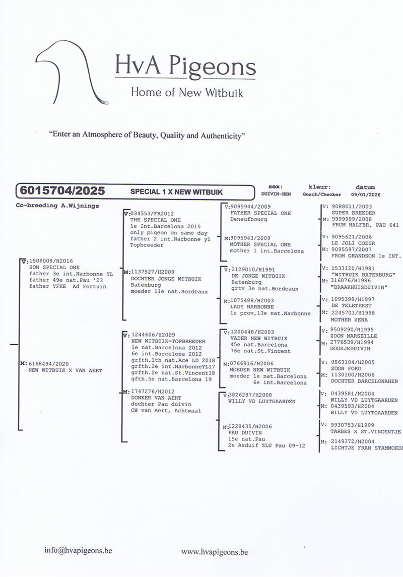 Father (Co-breeding A.Wijnings) is son Special One, 1th international Barcelona 2015 x daughter Jonge Witbuik Batenburg