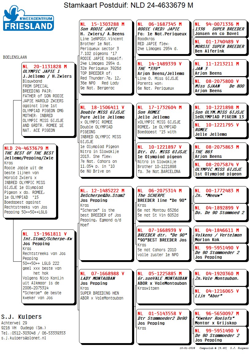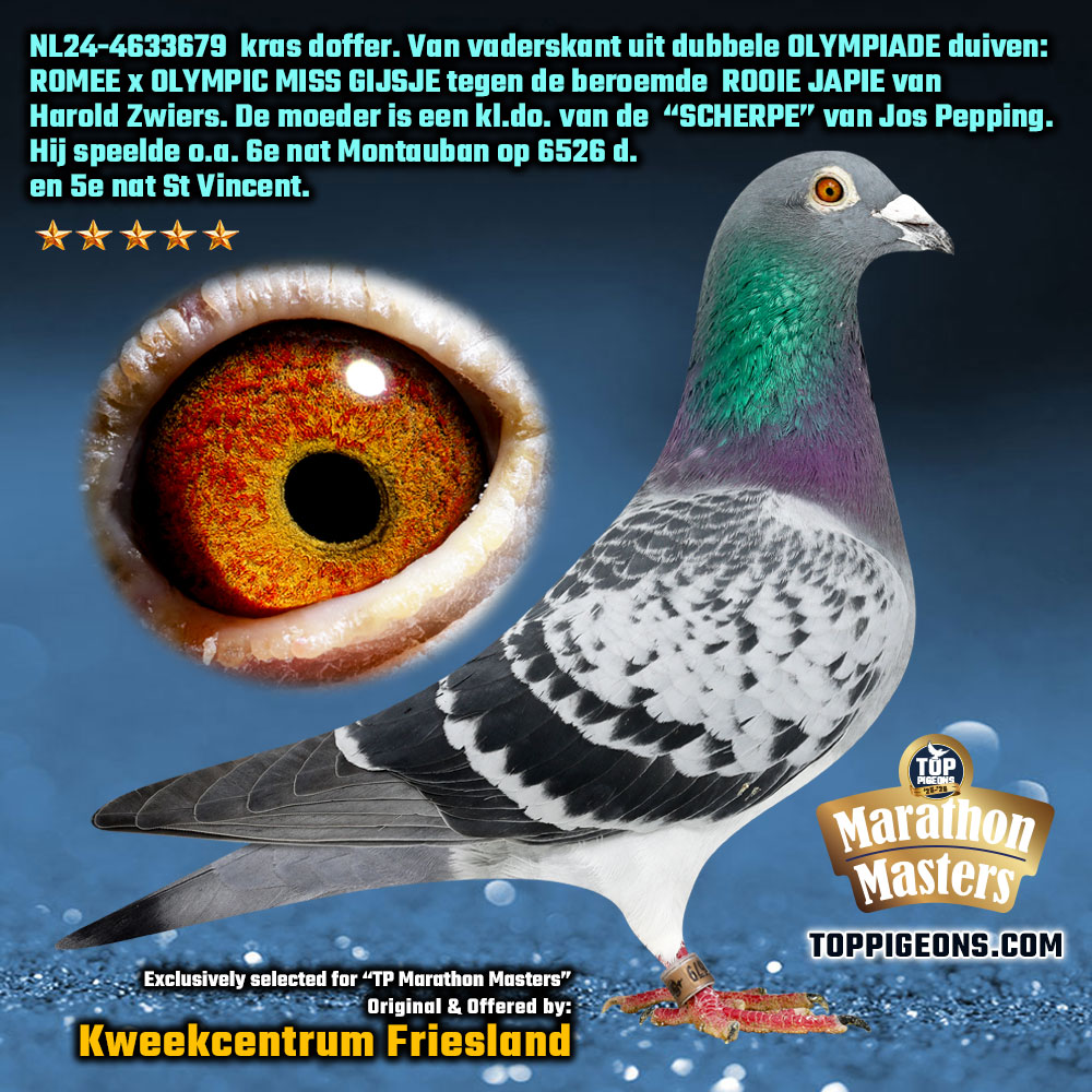 NL24-4633679 kras doffer. Van vaderskant uit dubbele OLYMPIADE duiven: ROMEE x OLYMPIC MISS GIJSJE tegen de beroemde ROOIE JAPIE van Harold Zwiers. De moeder is een kl.do. van de “SCHERPE” van Jos Pepping. Hij speelde o.a. 6e nat Montauban op 6526 d. en 5e nat St Vincent