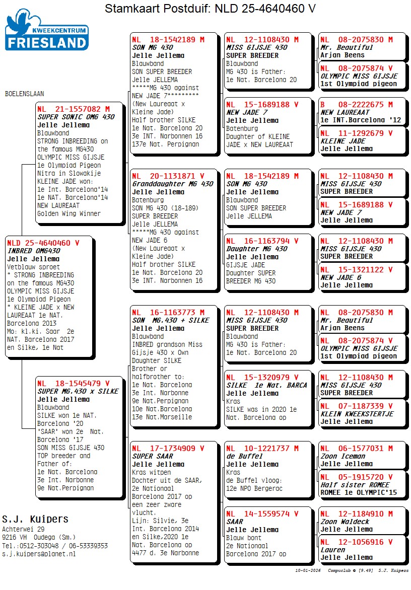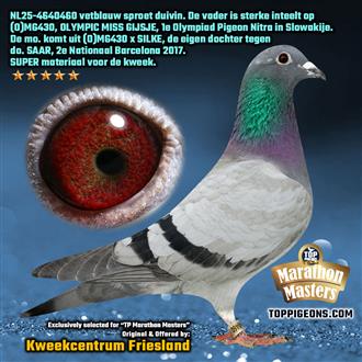 NL25-4640460 vetblauw sproet duivin. De vader is sterke inteelt op (O)MG430, OLYMPIC MISS GIJSJE, 1e Olympiad Pigeon Nitra in Slowakije.