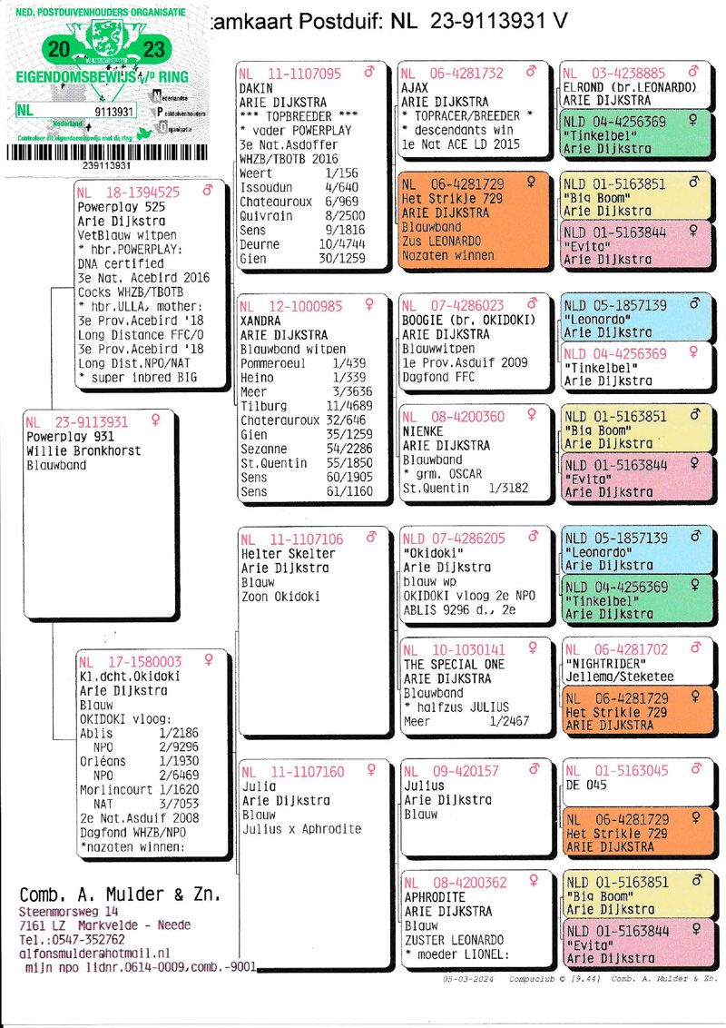 Gekweekt uit 2 rechtstreekse duiven van Arie Dijkstra