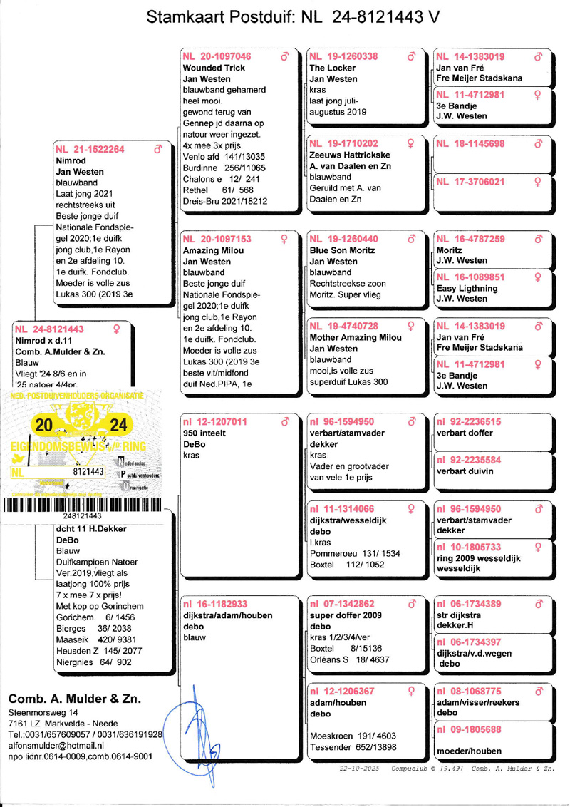 Moeder > duifkampioen natoer 7/7 met o.a. 6e Gorinchem 1.456 d.
