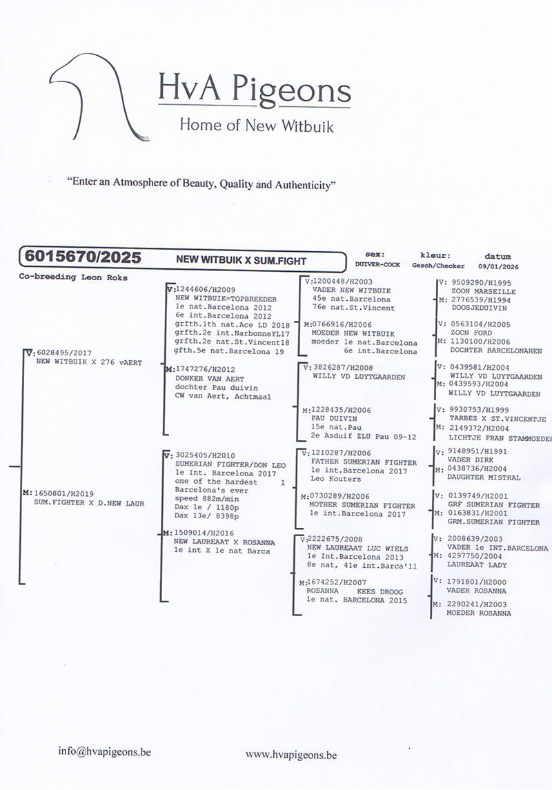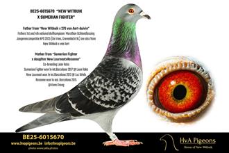 BE25-6015670 NEW WITBUIK X SUMERIAN FIGHTER Father from New Witbuik x 276 Van Aert duivin Mother from Sumerian Fighter x dtr. New Laureaat x Rosanne